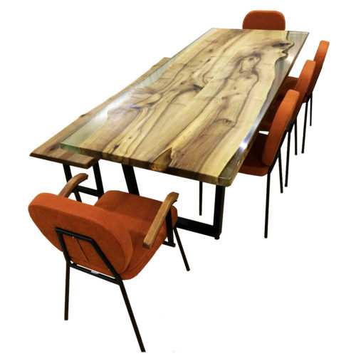 Table à manger en Noyer et époxy, pieds en métal, Parnal